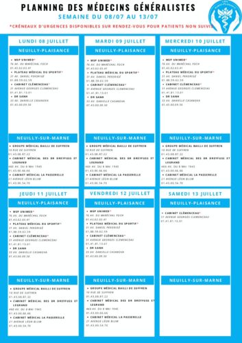 À cet effet, profitant de l’occasion d’être réunis au travers de la CPTS Marne-Plaisance, nous avons souhaité pouvoir reconduire la mise à disposition d’un planning recensant les disponibilités estivales des médecins généralistes adhérents et pouvoir le mettre à disposition des professionnels et patients du territoire.