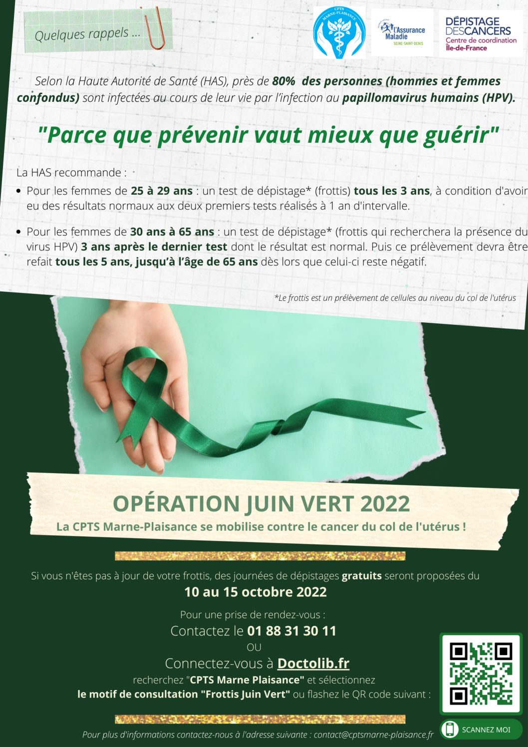 Comme lors de chaque période de prévention, la CPTS Marne-Plaisance a pris part à la campagne nationale de dépistage du cancer du col de l’utérus.