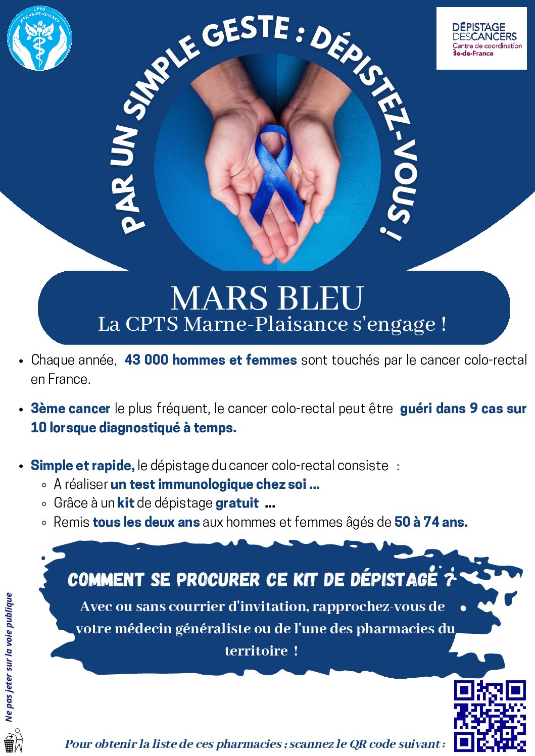 Au coeur des campagnes de dépistages nationales ; la CPTS Marne-Plaisance s’engage à vos côtés pour Mars Bleu : campagne de dépistage contre le cancer colo-rectal !