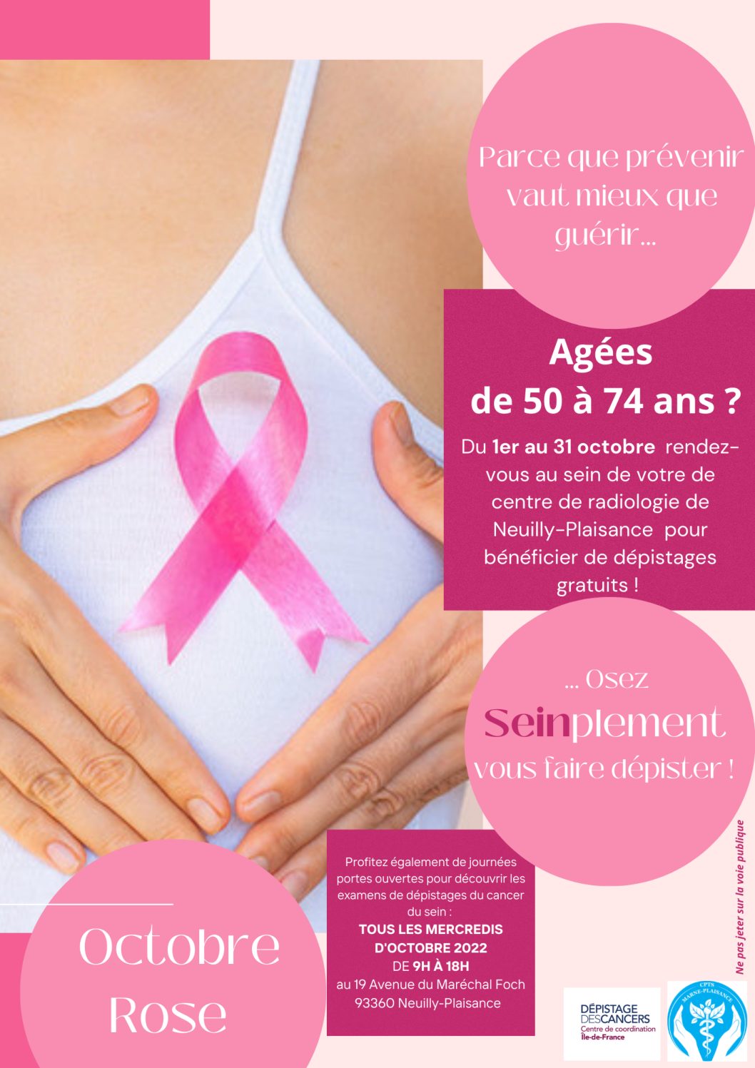 Des journées portes ouvertes visant à faire découvrir les examens de dépistage du cancer du sein sont également organisées tous les mercredis d’octobre 2022 de 9h à 18h au 19 Avenue Maréchal Foch 93360 Neuilly-Plaisance.