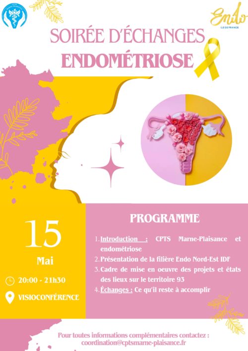 La CPTS Marne-Plaisance tient à vous informer de la tenue d’une prochaine soirée d’échanges autour de la thématique d’endométriose le mercredi 15 mai de 20h à 21h30.